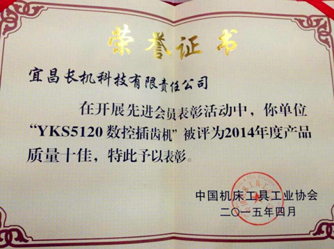 4月20日中國國際機(jī)床展覽會(huì)上,公司YKS5120數(shù)控插齒機(jī)獲中國機(jī)床工具工業(yè)協(xié)會(huì)授予的“2014年度產(chǎn)品質(zhì)量十佳”榮譽(yù)。