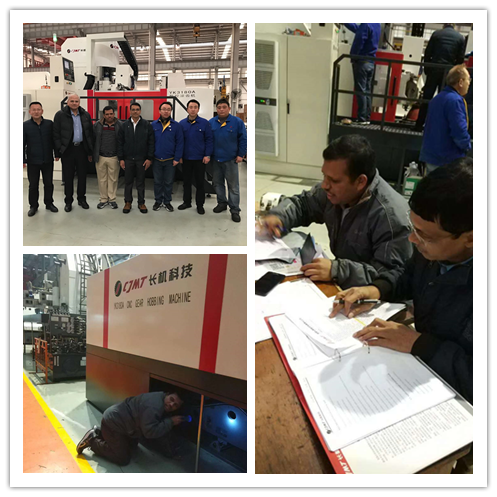 2018年1月2日,在大雪紛飛之時,印度客戶一行三人前往我公司對YK3180A/7進行驗收。該機床主軸采用高精度滾動軸承定位,傳動鏈末端使用消隙機構(gòu),工作臺采用高精度轉(zhuǎn)臺軸承和雙蝸輪蝸桿消隙,滿足機床高效、高速、高精加工要求??蛻纛A驗收使用A級刀滾切蝸輪,加工精度達到GB5級,驗收合格。