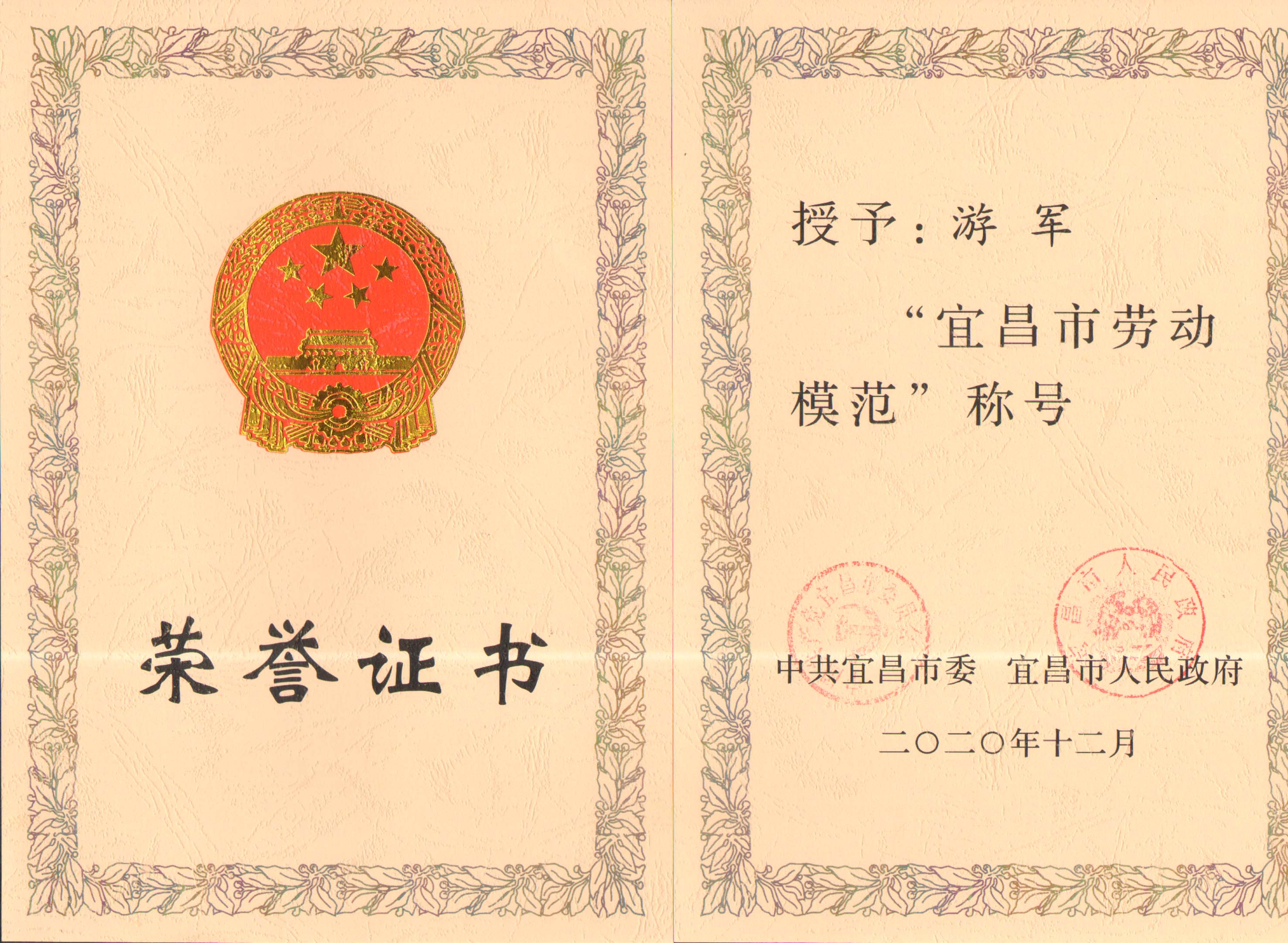 游軍被授予“宜昌市勞動(dòng)模范”稱號(hào)