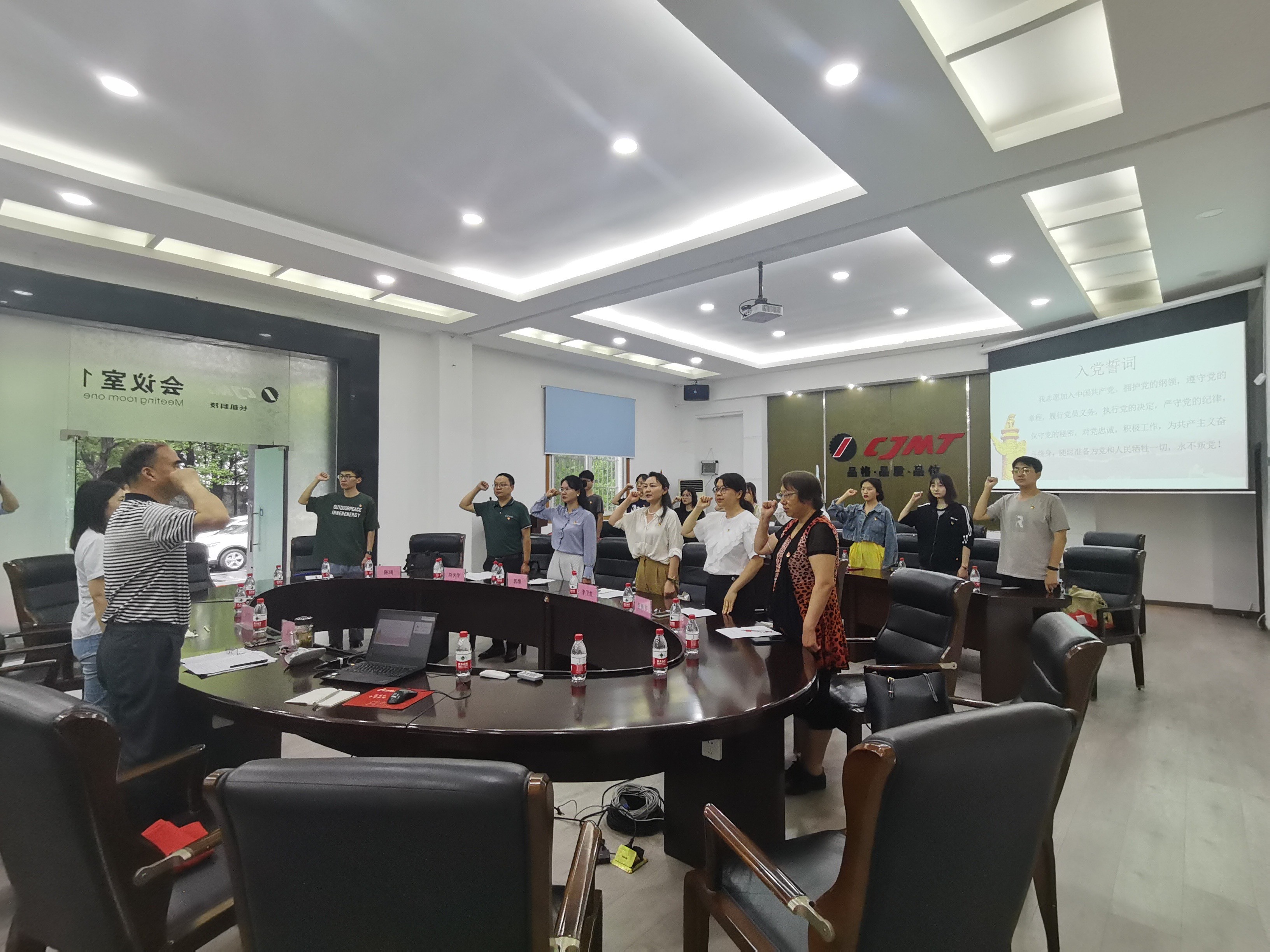 2023年6月16日下午,三峽大學(xué)外國(guó)語學(xué)院黨委書記李衛(wèi)紅、副書記郭維帶領(lǐng)學(xué)院師生代表,來公司開展“2023屆畢業(yè)生黨員專題黨日暨訪企拓崗”活動(dòng)。公司黨委書記段作東、研發(fā)中心總經(jīng)理盧宇、人力資源經(jīng)理?xiàng)盍釁⒓恿舜舜位顒?dòng)?;顒?dòng)開始,學(xué)生代表在人力資源經(jīng)理?xiàng)盍岬膸ьI(lǐng)下前往公司制造中心參觀,了解企業(yè)基本情況和企業(yè)文化。隨后一行人來到公司卓越樓會(huì)議室開展了主題黨日活動(dòng)?,F(xiàn)場(chǎng)所有黨員用鏗鏘有力的聲音重溫了入黨誓詞,銘記入黨初心。