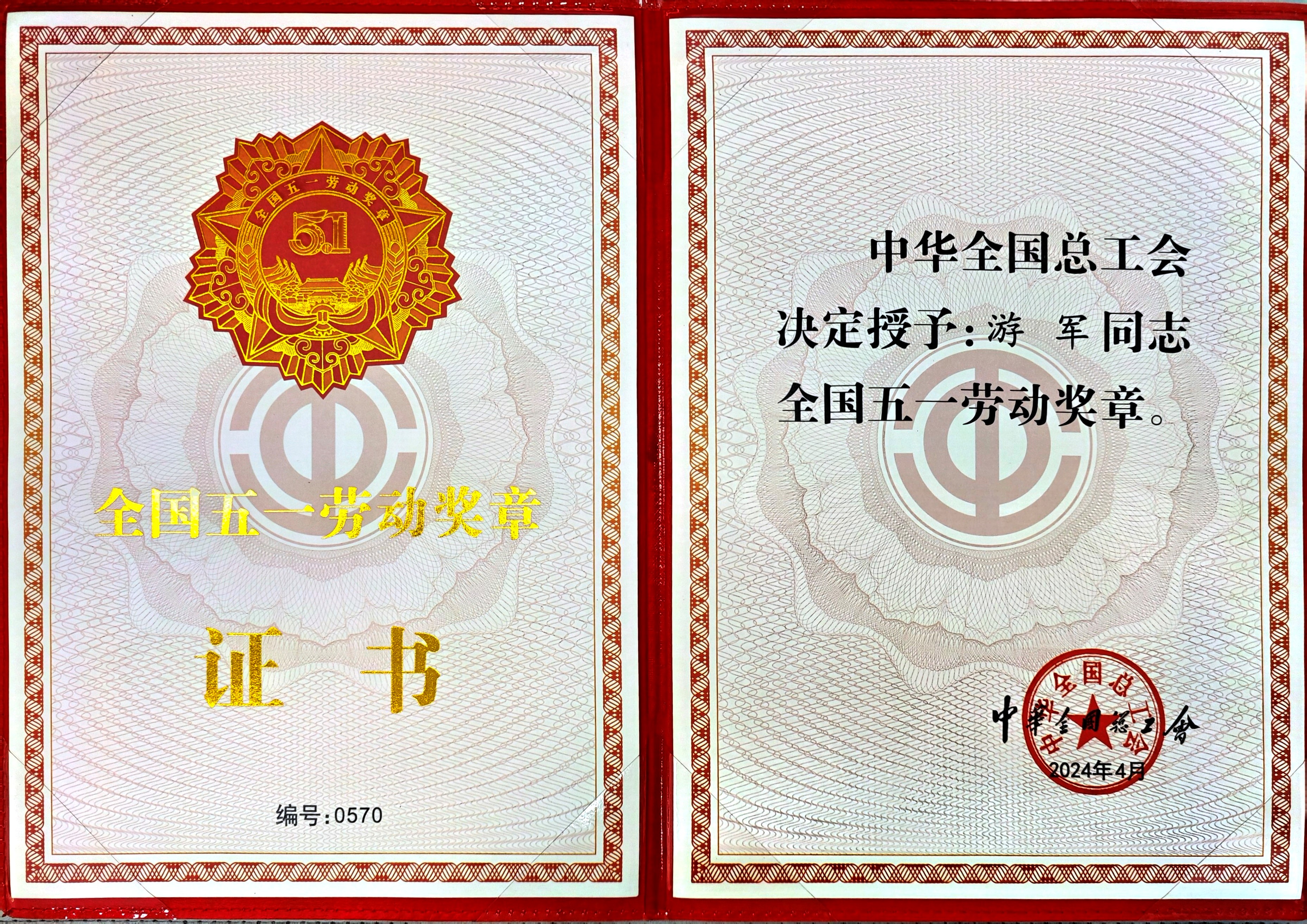 (游軍“全國(guó)五一勞動(dòng)獎(jiǎng)?wù)隆睒s譽(yù)證書)